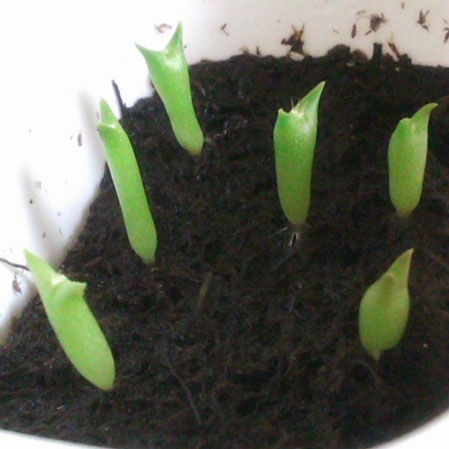 一番早くに出てきていた芽(先が赤くなっちゃってたやつ)がもうヘロヘロになってしまいました。左奥のしおれてるやつです。
