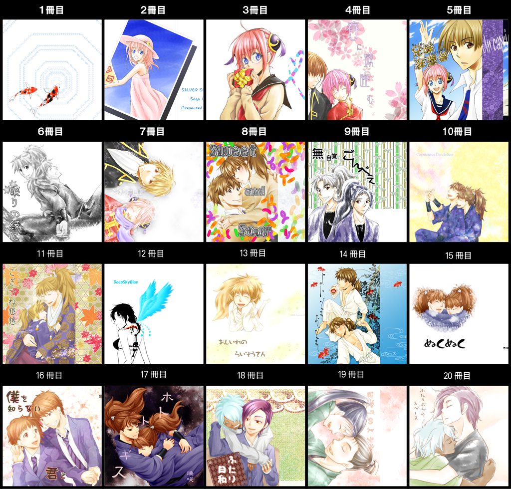 ジャンルが5つ(鰤、銀魂、忍玉、OP、イナGO)。一番多く出したのは忍玉で11冊でした。