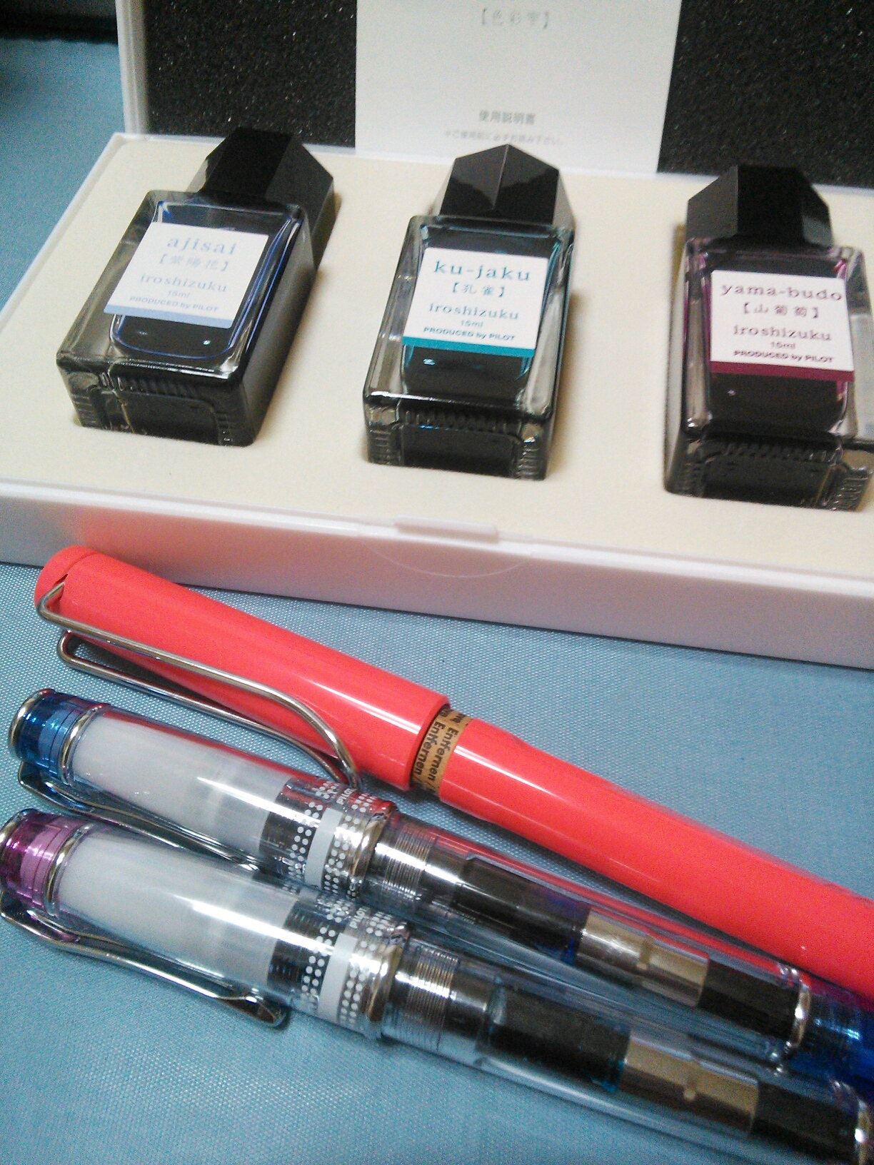 下の二本はパイロットの色彩逢いというシリーズのものです。ペン軸がスケルトンなので入れたインクの色が見えて楽しいです。